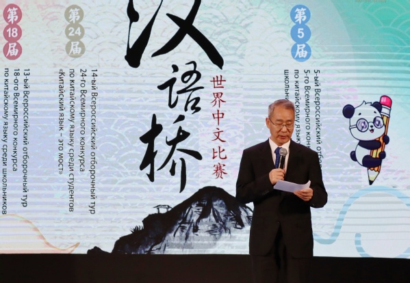 5月21日,22日和25日,由中华人民共和国驻俄罗斯联邦大使馆主办,伏尔加格勒国立社会师范大学孔子学院承办,俄罗斯新时代集团公司及中国东方航空公司赞助的第二十四届“汉语桥”世界大学生中文比赛、第十八届“汉语桥”世界中学生中文比赛及第五届“汉语桥”世界小学生中文秀俄罗斯赛区总决赛隆重举行。来自莫斯科、圣彼得堡、符拉迪沃斯托克、喀山、伊尔库茨克、叶卡捷琳堡及哈巴罗夫斯克七大领区的21名大学生组选手、17名中学生组选手齐聚伏尔加格勒市,17名小学组选手则通过线上方式参赛。中国驻俄罗斯大使馆公使衔参赞曹士海、伏尔加格勒国立社会师范大学校长亚历山大·科罗特科夫(Aleksandr Korotkov)、伏尔加格勒州经济政策与发展委员会代主席叶夫根尼·乌斯科夫 (Evgeniy Uskov)参加了开幕式并致辞。中国驻俄罗斯大使馆教育处三秘刘箐、张宏江,中国驻圣彼得堡总领事馆教育领事马晓迪,俄罗斯新时代集团公司董事长董永明应邀出席活动并为获奖选手颁奖,共同见证了这一中俄语言文化交流的重要时刻。曹士海公参在致辞中首先代表中国驻俄罗斯大使馆教育处,对伏尔加格勒州政府对本次活动的大力协助、伏尔加格勒国立社会