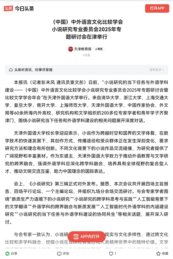 【媒体天外】《社会科学报》官网报道“小说研究的当下任务与外语学科建设——(中国)中外语言文化比较学会小说研究专业委员会2025年专题研讨会暨天津市比较文学学会年会”在我校顺利召开。全文转载如下:“小说研究的当下任务与外语学科建设——(中国)中外语言文化比较学会小说研究专业委员会2025年专题研讨会暨天津市比较文学学会年会”顺利召开 新时代新征程,世界百年未有之大变局加速演进,中华民族伟大复兴进入关键时期,小说研究与外语学科建设正迎来前所未有的机遇与挑战。2025年9月20日至21日,由(中国)中外语言文化比较学会小说研究专业委员会、上海师范大学比较文学与世界文学国家重点学科、天津市比较文学学