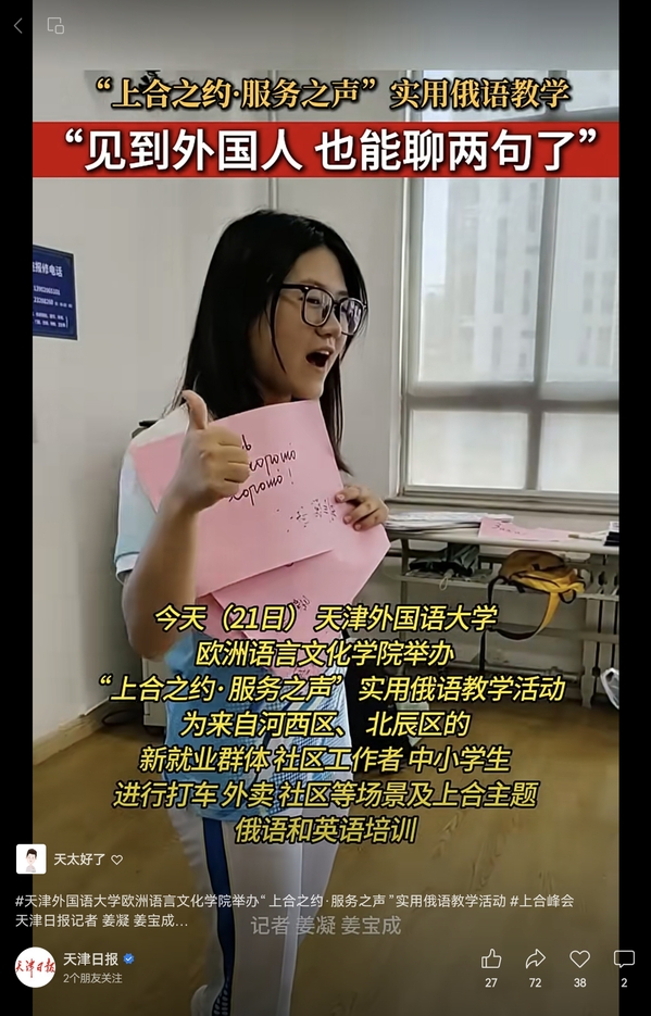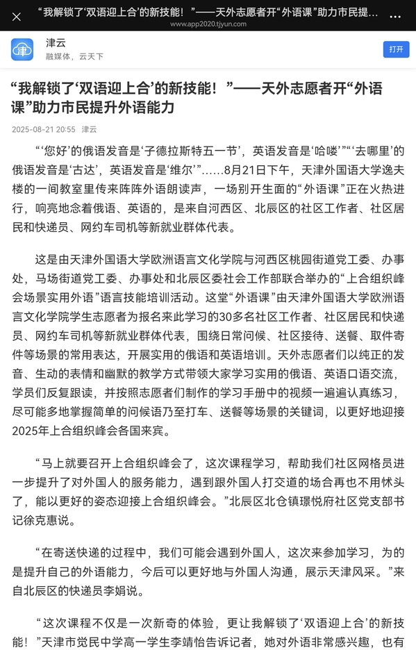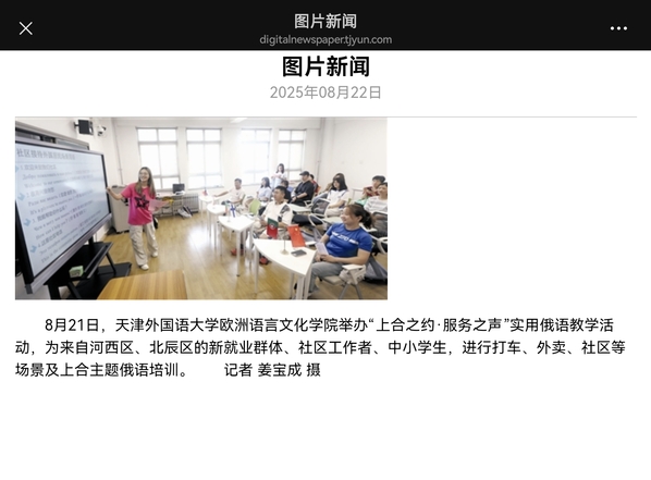 天津日报报道我校欧洲语言文化学院举办“上合之约·服务之声”实用俄语教学活动。全文转载如下: 8月21日,荣耀体育官方网站_荣耀体育jiangnan(中国)欧洲语言文化学院举办“上合之约·服务之声”实用俄语教学活动,为来自河西区、北辰区的新就业群体、社区工作者、中小学生,进行打车、外卖、社区等场景及上合主题俄语培训。新闻来源:https://digitalnewspaper.tjyun.com/newspaper/v7.5/jwbDetail.html?resultId=870254_b910b874f203c55d2ab2f6b467dd0bdfdf0a58f2d590b2defb08bf1c528ba5a8&la