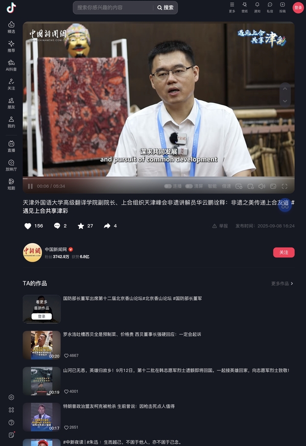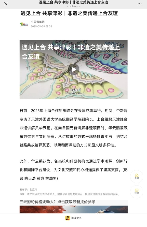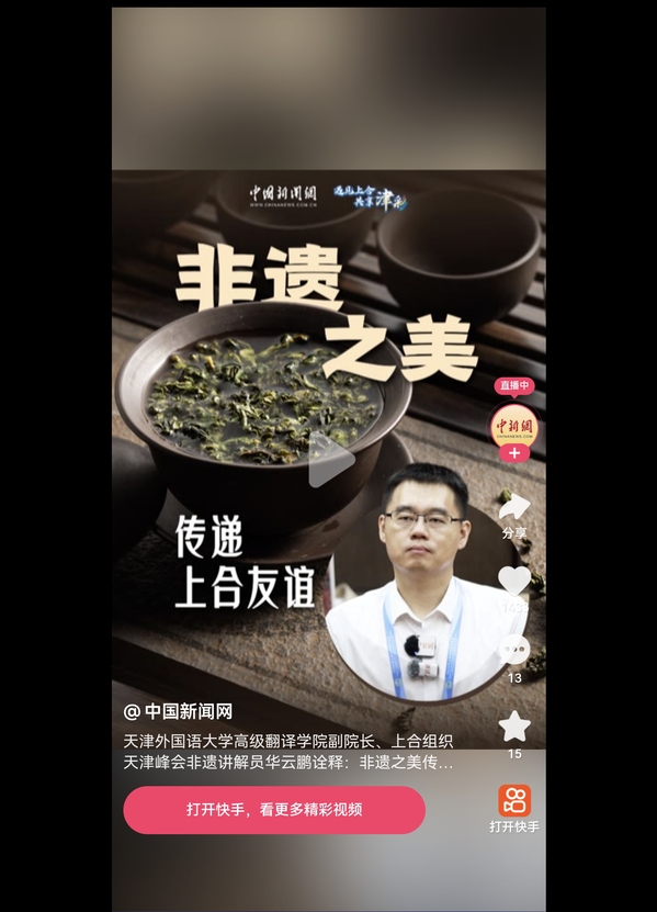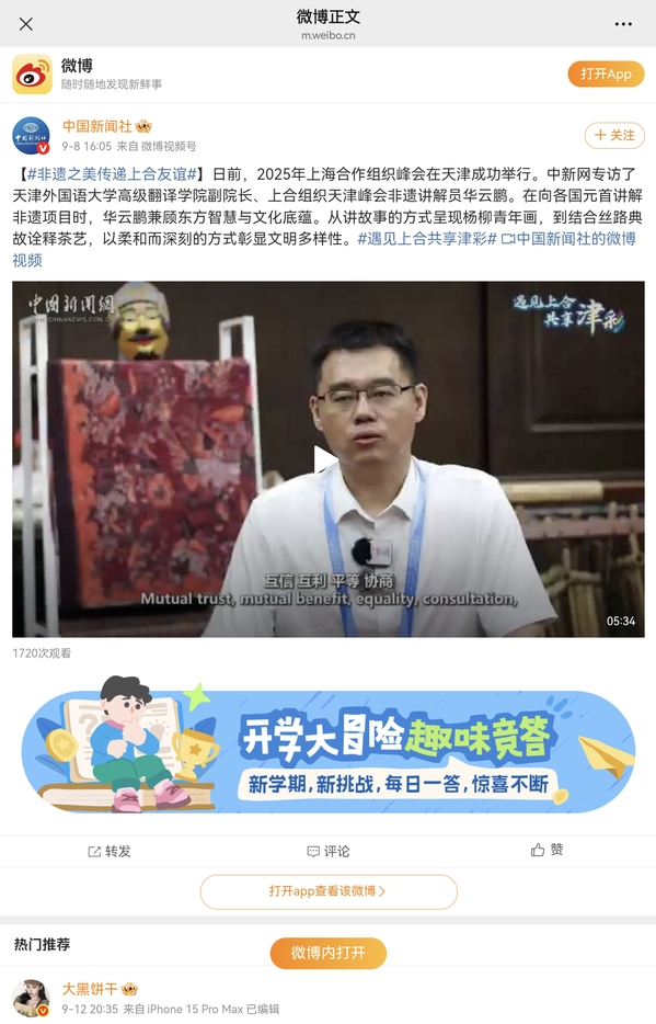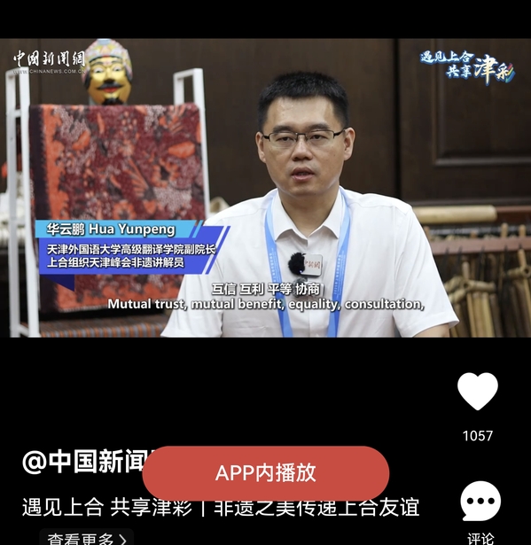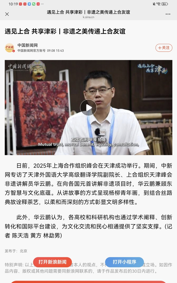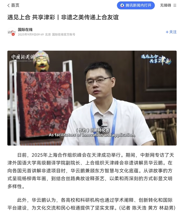 【相约上合】上合峰会期间,中新社专访了我校高级翻译学院副院长、上合组织天津峰会非遗讲解员华云鹏。报道通过中新社全媒体平台发布,并由中央网信办向全网推送。报道指出,在向各国元首讲解非遗项目时,华云鹏兼顾东方智慧与文化底蕴。从讲故事的方式呈现杨柳青年画,到结合丝路典故诠释茶艺,以柔和而深刻的方式彰显文明多样性。他认为,各高校和科研机构也通过学术阐释、创新转化和国际平台建设,为文化交流和民心相通提供了坚实支撑。全文转载如下:日前,2025年上海合作组织峰会在天津成功举行。期间,中新网专访了荣耀体育官方网站_荣耀体育jiangnan(中国)高级翻译学院副院长、上合组织天津峰会非遗讲解员华云鹏。在向各国元首讲解非遗项目时,华云鹏兼顾东方智