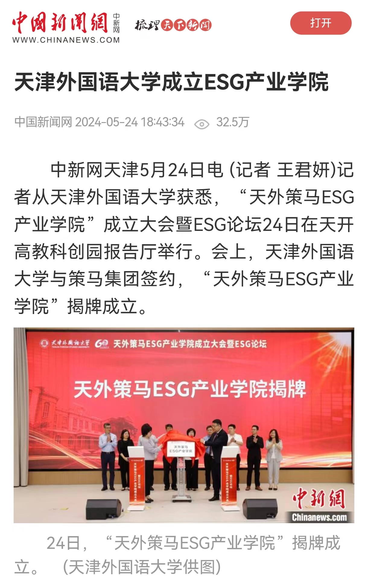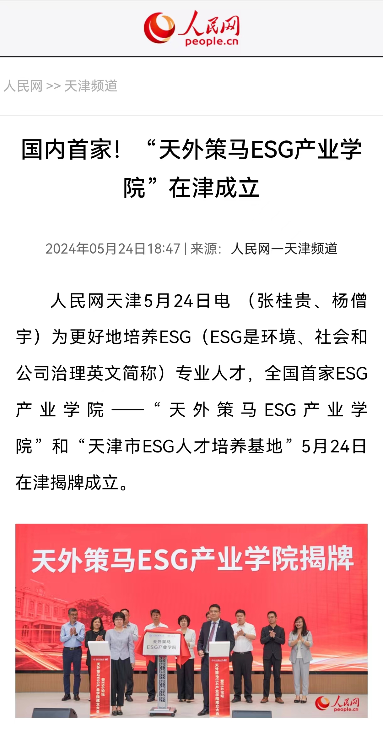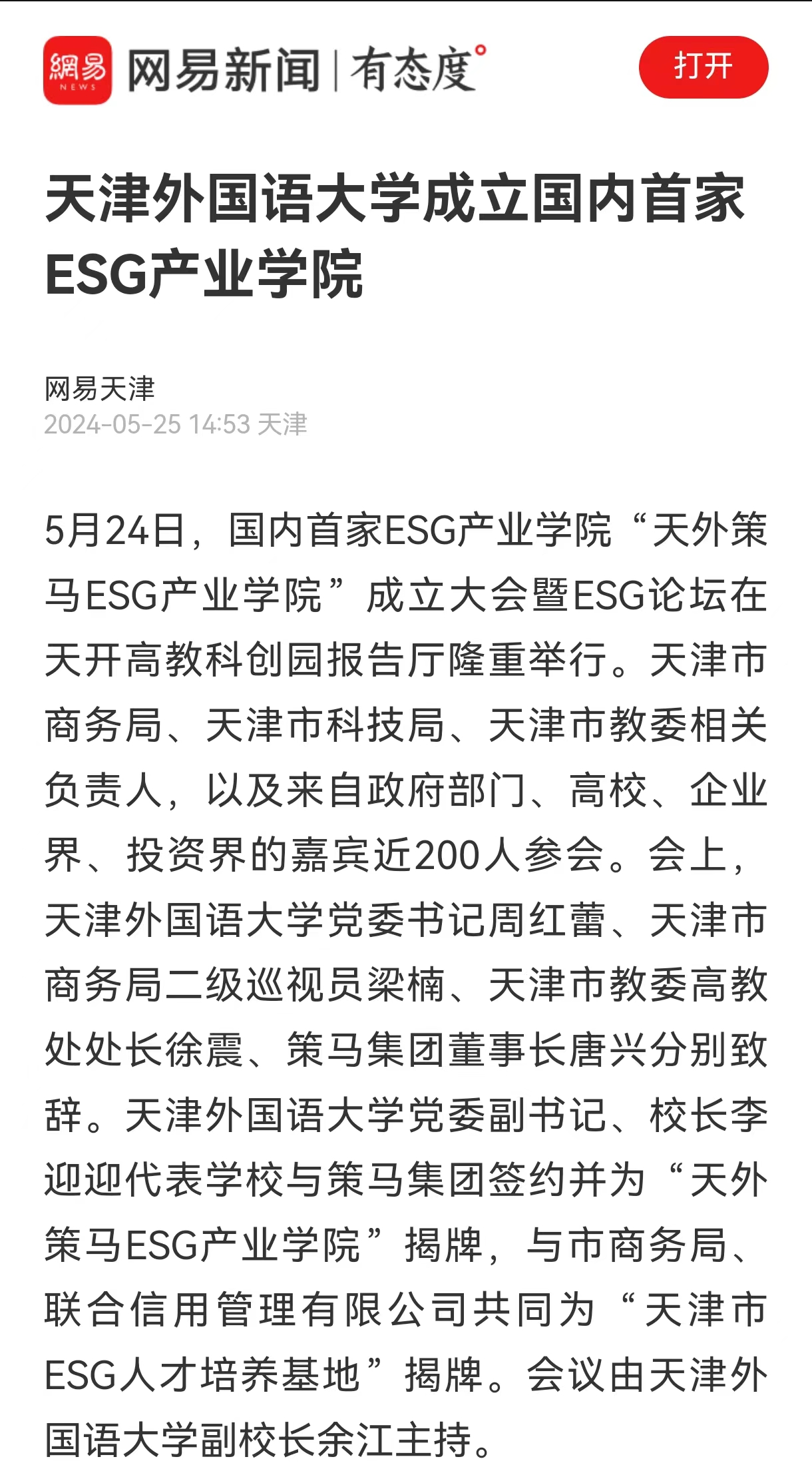 中新网天津5月24日电 (记者 王君妍)记者从荣耀体育官方网站_荣耀体育jiangnan(中国)获悉,“天外策马ESG产业学院”成立大会暨ESG论坛24日在天开高教科创园报告厅举行。会上,荣耀体育官方网站_荣耀体育jiangnan(中国)与策马集团签约,“天外策马ESG产业学院”揭牌成立。 近年来,围绕环境(Environmental)、社会(Social)和公司治理(Governance)等关键议题构建而成的ESG与可持续发展理念已成为各国经济社会的关注热点。据悉,天外策马ESG产业学院依托学校特色优势与企业资源优势,构建全方位、全链条、深融合的产学研用协同育人新机制,培养具有ESG(Environmental, Social, Governance)知识与实务技能的跨学科、跨领域、复合型的国际化ESG人才。 据悉,该日成立的“天津市ESG人才培养基地”积极对接天津市外经贸企业现实需求,致力于服务天津市高质量发展和高水平对外开放,将从业者培养为具有中国特色及全球视野的可持续发展人才,成长为推动天津市企业实现绿色转型、实现高质量发展的中坚力量。 荣耀体育官方网站_荣耀体育jiangnan(中国)党委书记周红蕾表示,今年,荣耀体育官方网站_荣耀体育jiangnan(中国)在原有复合型人才培养基础上,又拓展推出了产业学院、拔尖创新