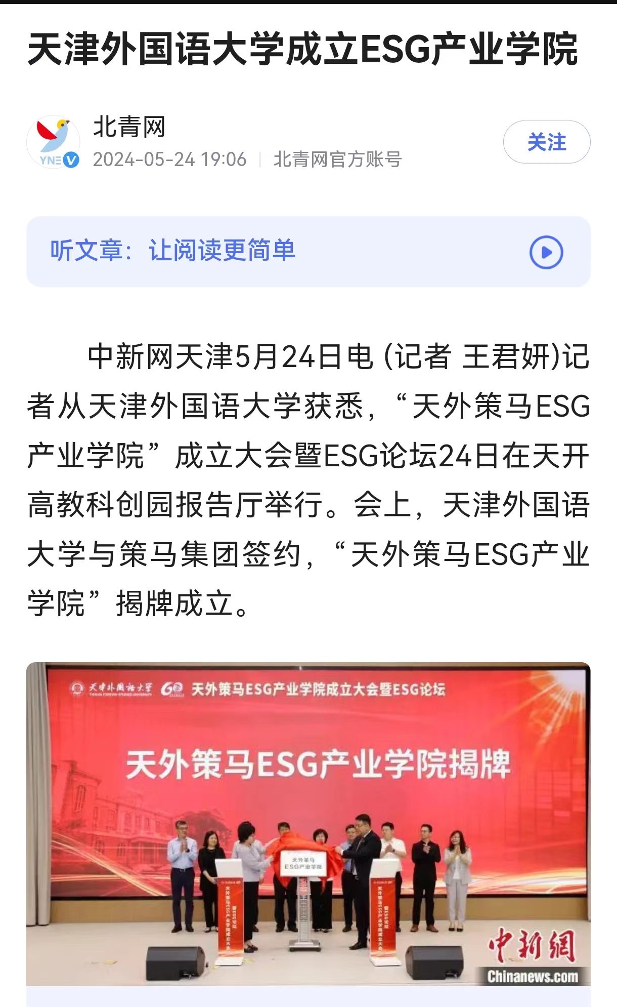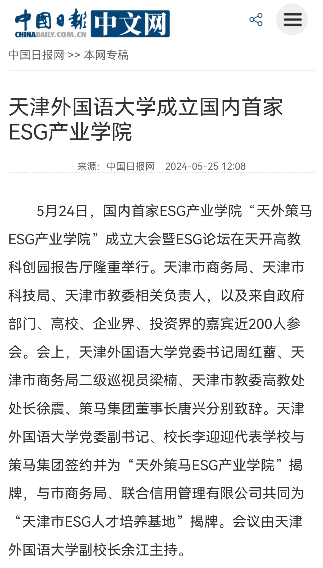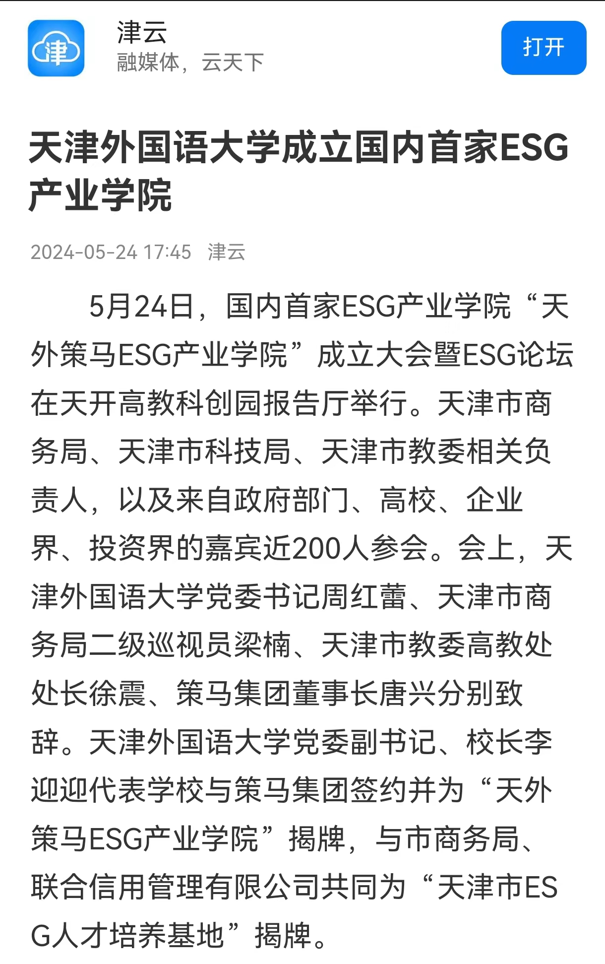中新网天津5月24日电 (记者 王君妍)记者从荣耀体育官方网站_荣耀体育jiangnan(中国)获悉,“天外策马ESG产业学院”成立大会暨ESG论坛24日在天开高教科创园报告厅举行。会上,荣耀体育官方网站_荣耀体育jiangnan(中国)与策马集团签约,“天外策马ESG产业学院”揭牌成立。 近年来,围绕环境(Environmental)、社会(Social)和公司治理(Governance)等关键议题构建而成的ESG与可持续发展理念已成为各国经济社会的关注热点。据悉,天外策马ESG产业学院依托学校特色优势与企业资源优势,构建全方位、全链条、深融合的产学研用协同育人新机制,培养具有ESG(Environmental, Social, Governance)知识与实务技能的跨学科、跨领域、复合型的国际化ESG人才。 据悉,该日成立的“天津市ESG人才培养基地”积极对接天津市外经贸企业现实需求,致力于服务天津市高质量发展和高水平对外开放,将从业者培养为具有中国特色及全球视野的可持续发展人才,成长为推动天津市企业实现绿色转型、实现高质量发展的中坚力量。 荣耀体育官方网站_荣耀体育jiangnan(中国)党委书记周红蕾表示,今年,荣耀体育官方网站_荣耀体育jiangnan(中国)在原有复合型人才培养基础上,又拓展推出了产业学院、拔尖创新