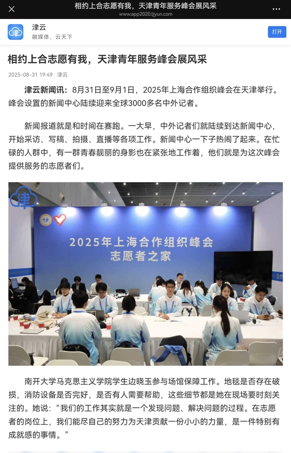 【相约上合】新华社报道上合峰会中的青春力量,我校志愿者在嘉宾接待、证件注册、物资分发等岗位上服务,在新闻中心与机器人一起“比心”留影。全文转载如下:2025年上海合作组织峰会于8月31日至9月1日在天津举行。来自天津市10所高校的约千名青年志愿者在嘉宾接待、证件注册、物资分发等岗位上服务,展现青春力量。8月27日,志愿者在媒体记者取证中心整理证件。 新华社记者 李然 摄8月31日,志愿者在新闻中心为外国记者翻译。 新华社记者 张笑宇 摄8月30日,志愿者在新闻中心引导媒体记者与多模态交互型机器人“小合”对话交流。 新华社记者 孙凡越 摄8月30日,来自荣耀体育官方网站_荣耀体育jiangnan(中国)的志愿者在新闻中心与机器人一