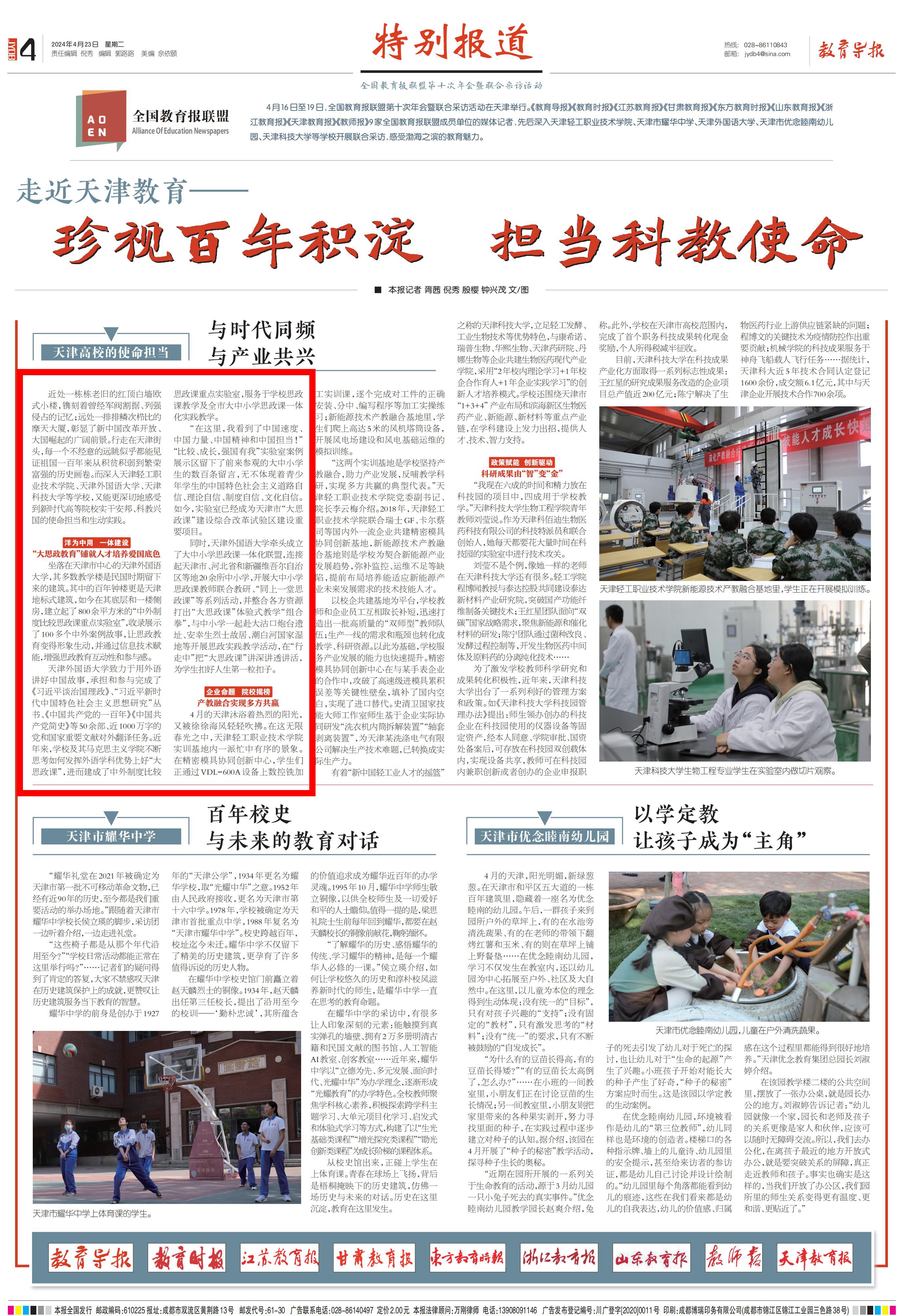 4月16日至19日,来自四川、河南、江苏、甘肃、上海、浙江、山东、陕西、天津等9个省市的9家全国教育报联盟成员单位的负责人、编辑、记者一行40余人齐聚“渤海明珠”天津,走进天津轻工职业技术学院、天津市耀华中学、荣耀体育官方网站_荣耀体育jiangnan(中国)、天津市优念睦南幼儿园、天津科技大学等学校开展联盟的第十次联合采访活动,对天津的基础教育、高等教育、职业教育进行全面而深入的探究,实地感受天津教育高质量发展的实践成果。天津科技大学:创新驱动,将智变金作为我国首批4所轻工类本科院校之一,天津科技大学(以下简称“天津科大”),有着“新中国轻工业人才的摇篮”等美誉。4月18日,记者一行先后走进学校科技园和工程技术中心,探索其在科研成果转化,服务经济发展方面的典型经验。“给我接一杯!”“好喝!醇正!”在天津科大纯鲜啤酒中试基地,品尝过学生酿出的啤酒后,记者们给出一致好评。“基地依托天津科大‘发酵工程’国家重点学科的优势,产学研用相结合,为发酵行业培养和提供优秀人才。在这里,学生将亲手酿制啤酒,完成毕业实习。”“在人才培养方面,学校除了通过校企合作联合培养,还重点推进本硕博贯通培养,探索多种育人途径。”天津科大党委宣传部副部