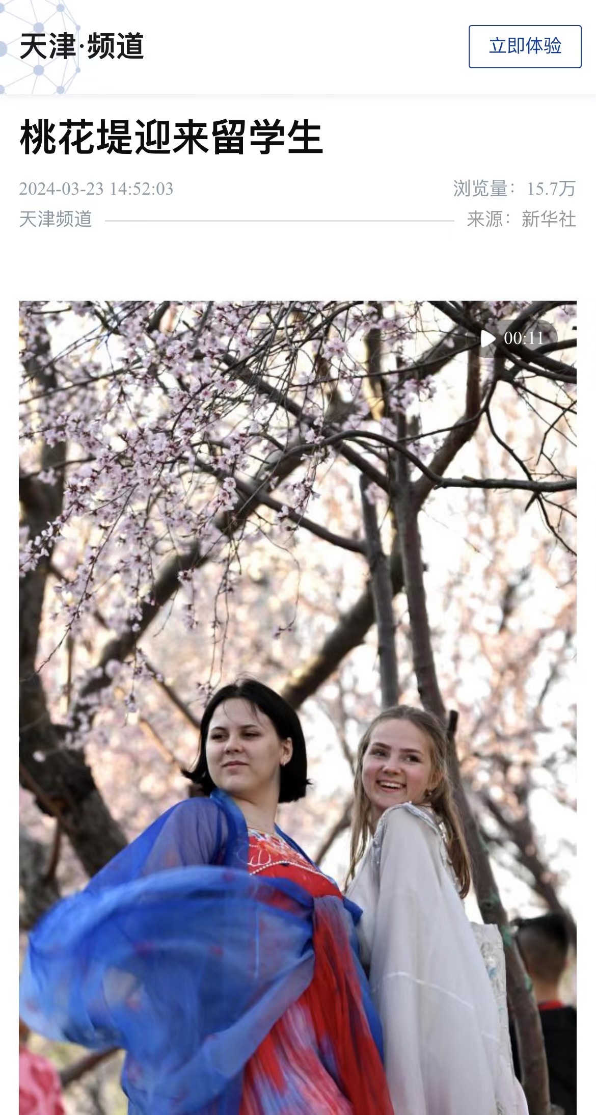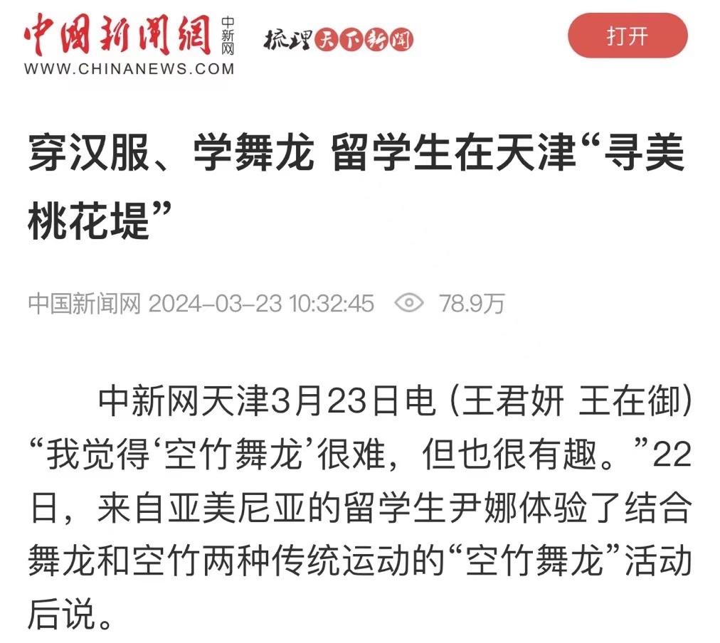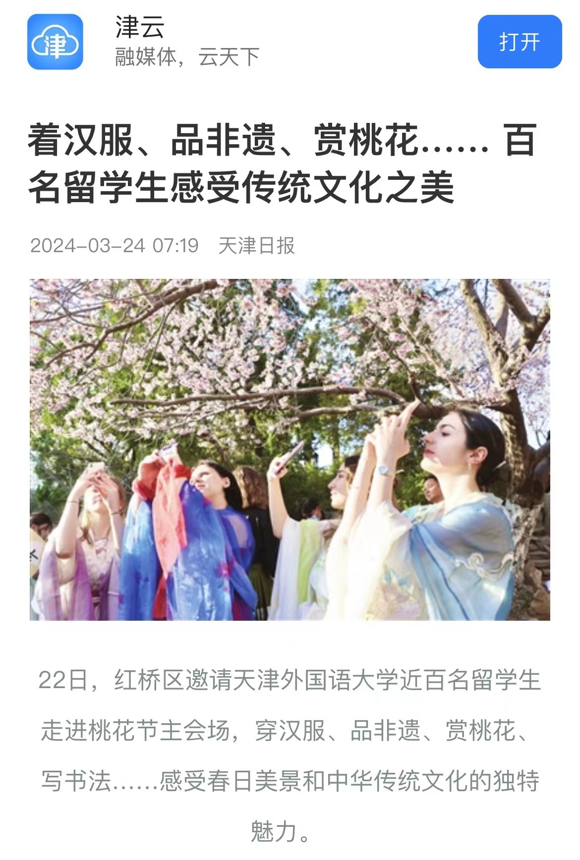 中新网天津3月23日电 (王君妍 王在御)“我觉得‘空竹舞龙’很难,但也很有趣。”22日,来自亚美尼亚的留学生尹娜体验了结合舞龙和空竹两种传统运动的“空竹舞龙”活动后说。 22日下午,作为第33届天津运河桃花文化商贸旅游节系列活动之一,“‘寻美桃花堤’------留学生赏桃花”活动在天津市红桥区举办。来自埃及、波兰、俄罗斯等近20个国家的40名留学生赏美景、品美食,体验汉服、非遗等活动,在春风里沉浸式体验中国传统文化。 “我很喜欢中国文化,它充满活力。”亲笔在扇面上写下“红桥”二字,尹娜兴奋地拍照留念,她希望以后能体验更多这类文化活动。 回族重刀、武术、书法……在西沽公园和桃花堤,丰富多彩的表演接连上演,赢得阵阵掌声与喝彩。 位于天津市红桥区北运河畔的桃花堤历史悠久,可追溯至大运河开通之时,至今已绵延六百余年。春风和煦,桃花初绽,海内外游客三五成群地漫步其中,游赏桃花美景,感受春日气息,品味运河文化。留学生们身着各种颜色的汉服漫步于桃花堤,为春日里的桃花添加一道特别的景色。 “让我印象最深的就是桃花堤,风景真的很美。”荣耀体育官方网站_荣耀体育jiangnan(中国)大二留学生孙柔佳来自埃及,已学习中文4年。“我来中国快