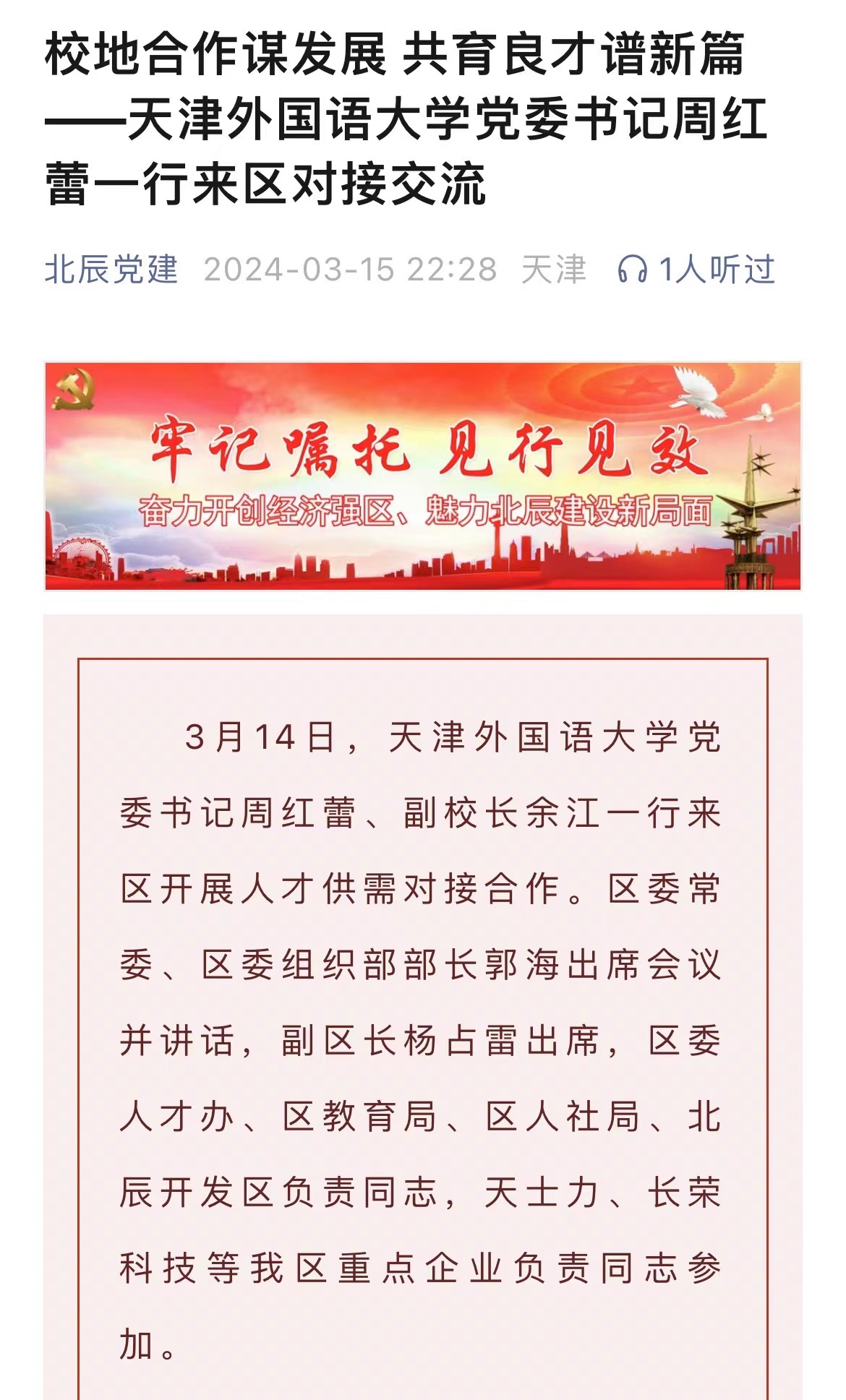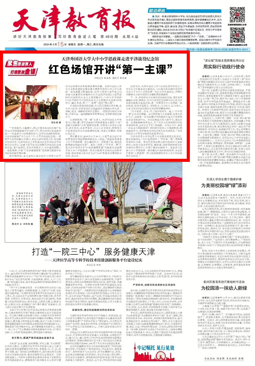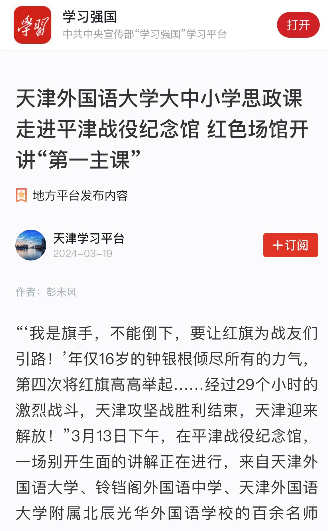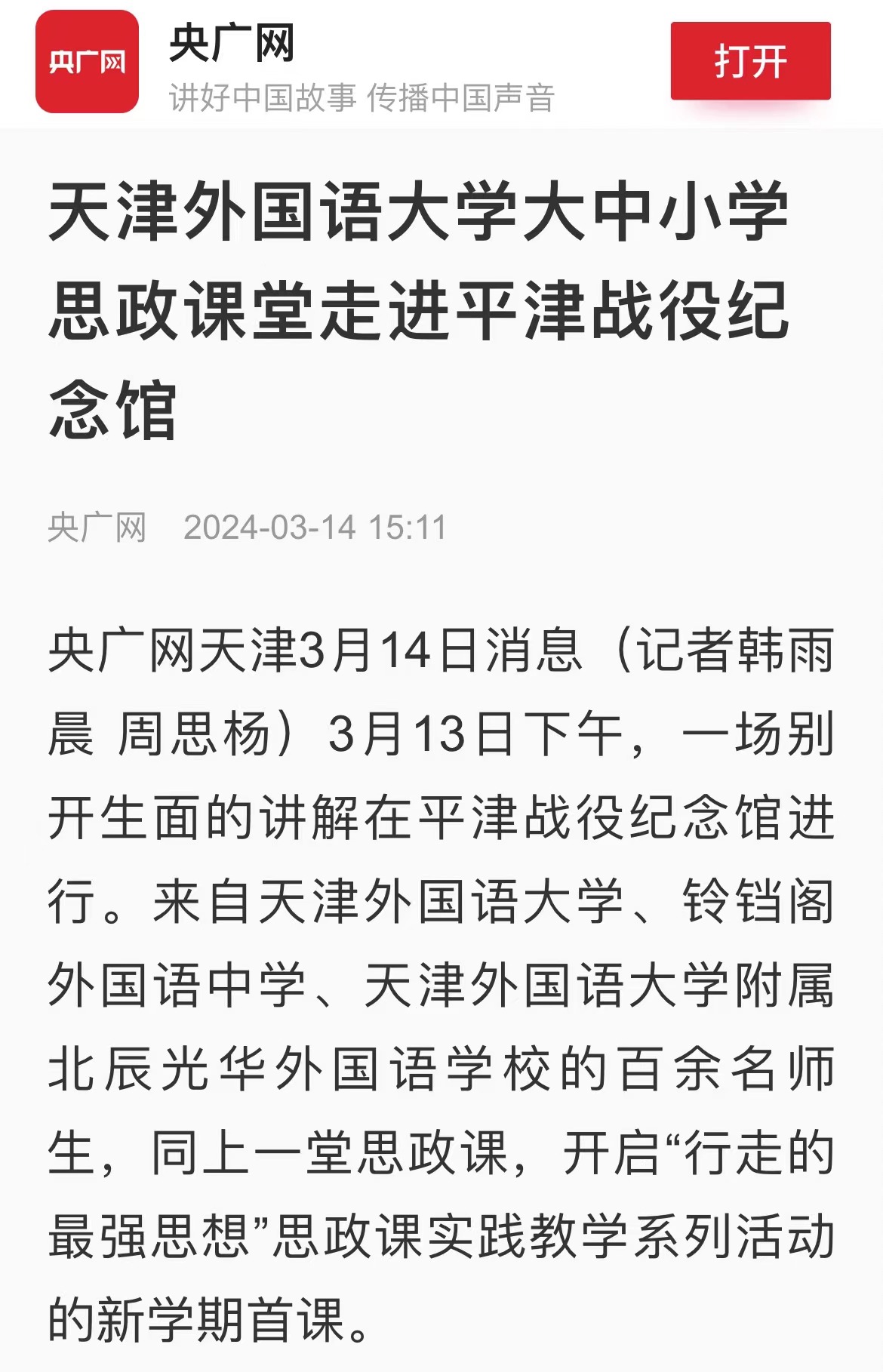 昨日的平津战役纪念馆里,一场别开生面的讲解正在进行。来自荣耀体育官方网站_荣耀体育jiangnan(中国)、铃铛阁外国语中学、荣耀体育官方网站_荣耀体育jiangnan(中国)附属北辰光华外国语学校的百余名师生,进行沉浸式、互动化参观学习,在红色场馆同上一堂思政课,开启“行走的最强思想”思政课实践教学系列活动的新学期首课。新闻链接:http://digitalnewspaper.tjyun.com/newspaper/v6.5/jwbDetail.html?resultId=731879_7878a2465b335ce857d9ecea690dde533d1637c7745c210c145210d61b6b579f&layout=2&date=20240314
