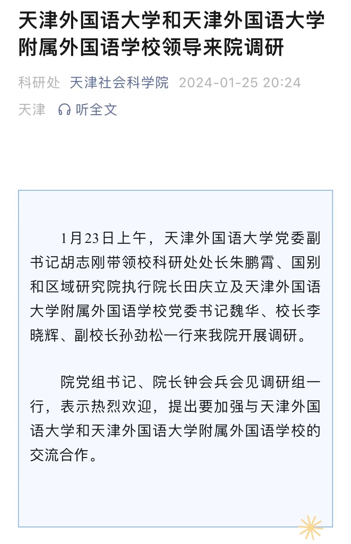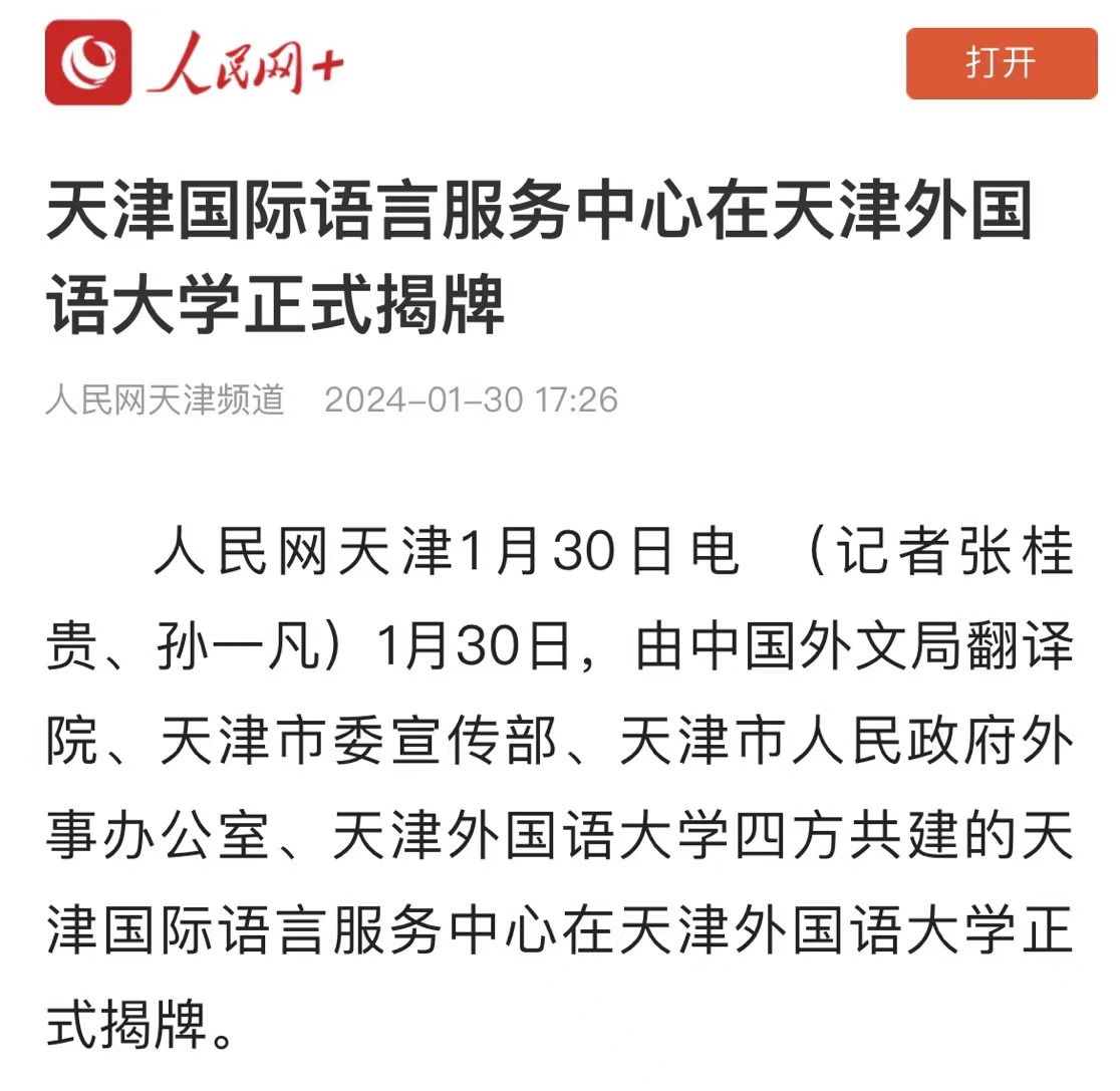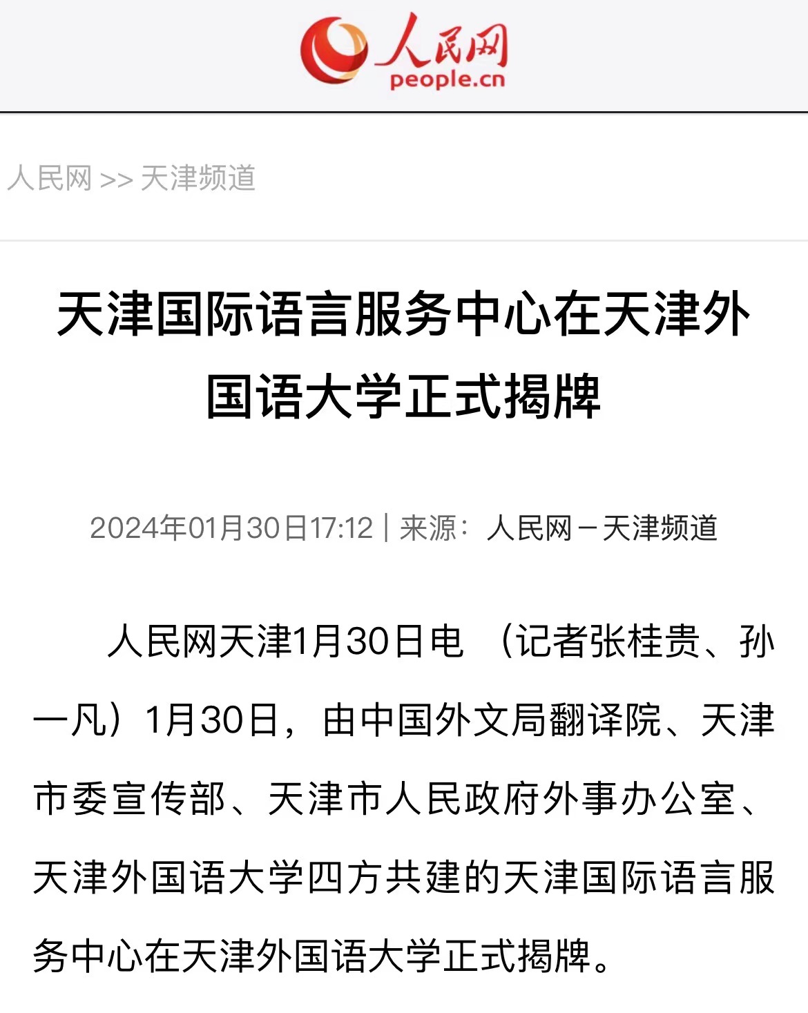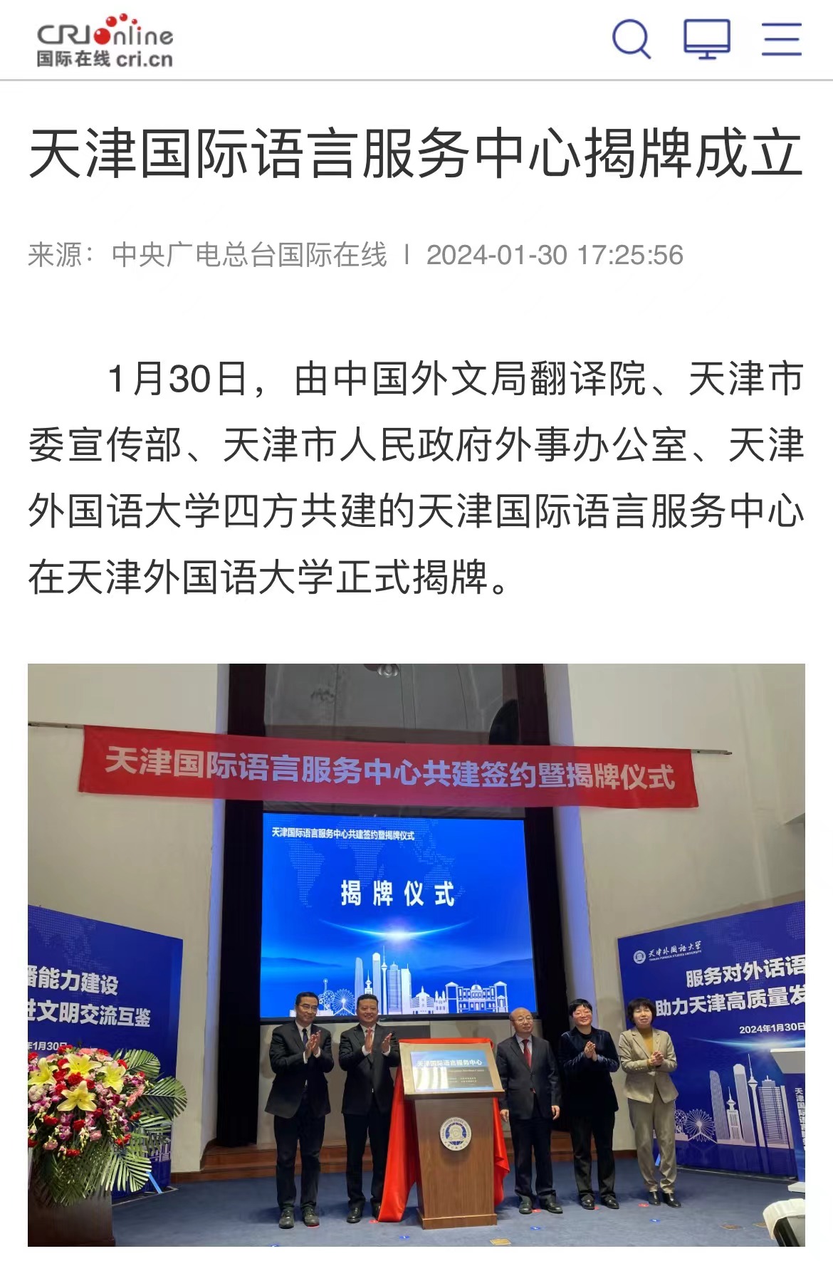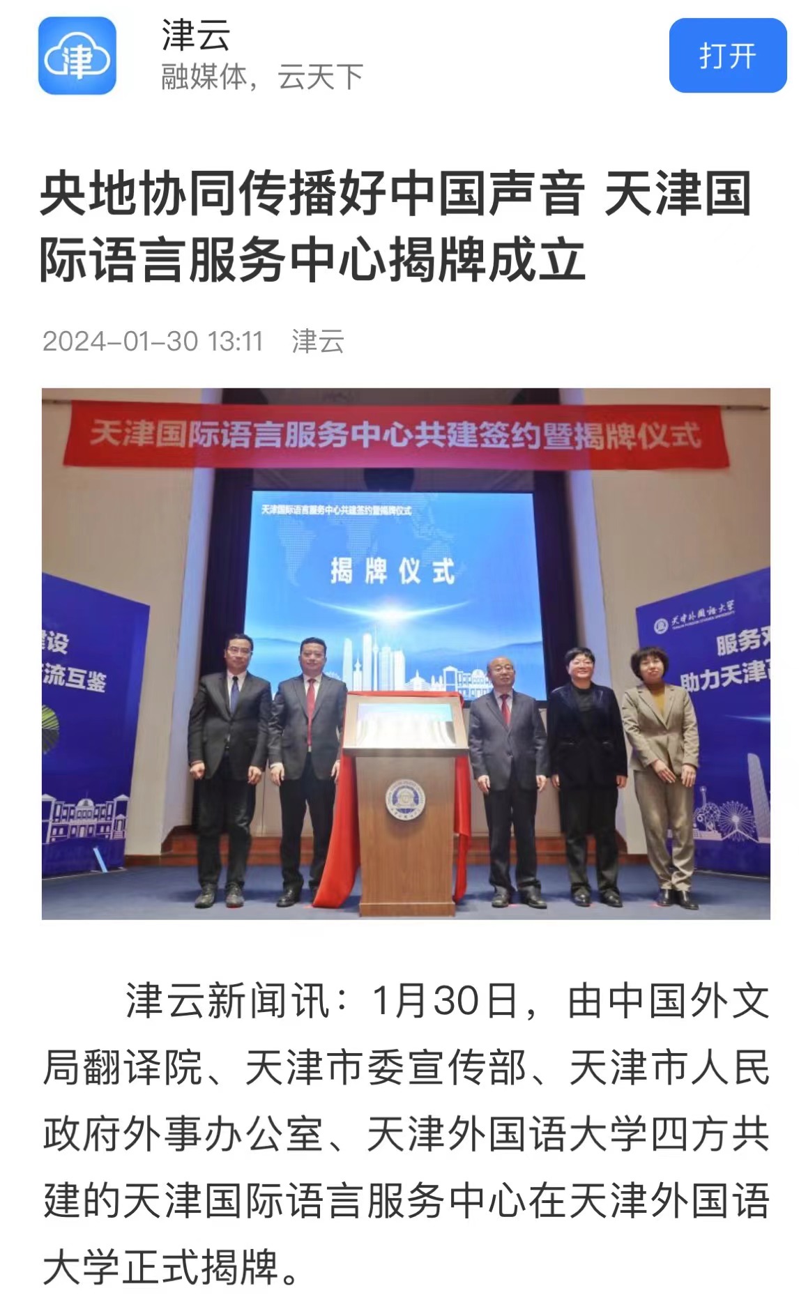1月30日,由中国外文局翻译院、天津市委宣传部、天津市人民政府外事办公室、荣耀体育官方网站_荣耀体育jiangnan(中国)四方共建的天津国际语言服务中心在荣耀体育官方网站_荣耀体育jiangnan(中国)正式揭牌。2023年9月,中国外文出版发行事业局(以下简称“中国外文局”)与天津市委宣传部签署了国际传播战略合作框架协议,就加强新时代中国特色社会主义思想国际传播合作、加强对外出版合作、加强媒体国际传播合作、加强外宣研究和翻译合作、加强文化产业相关合作、合力打造文化外宣品牌、合作培育外宣人才队伍等方面开展合作。此次天津国际语言服务中心揭牌成立,是落实合作协议精神的重要成果,旨在打造集服务政府决策、理论创新、实践育人于一体的新型语言服务机构,搭建加强国际传播能力建设、促进文明交流互鉴、助力天津社会主义现代化大都市建设及高水平对外开放的重要平台。荣耀体育官方网站_荣耀体育jiangnan(中国)党委书记周红蕾表示,荣耀体育官方网站_荣耀体育jiangnan(中国)(以下简称“天津外大”)充分发挥外语特色和语言优势,积极培养高水平外语人才,迄今已招收博士研究生近百人,32人已获得博士学位。同时,天津外大大力开展党和国家重要文献对外翻译,已完成《中国共产党一百年》(第一、二卷)等53部文献外译任务,在海内外引发热烈反响。天津国际语言