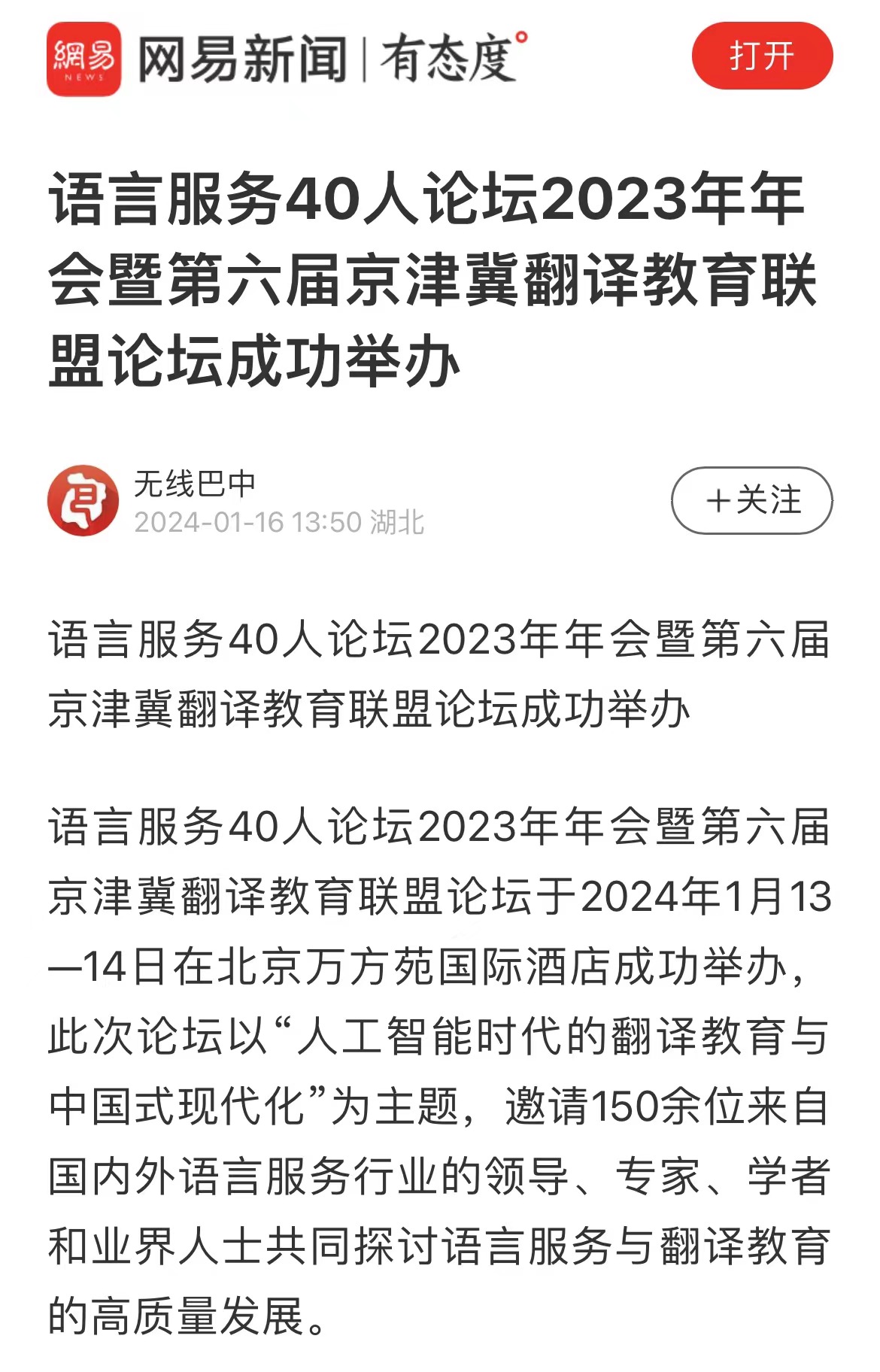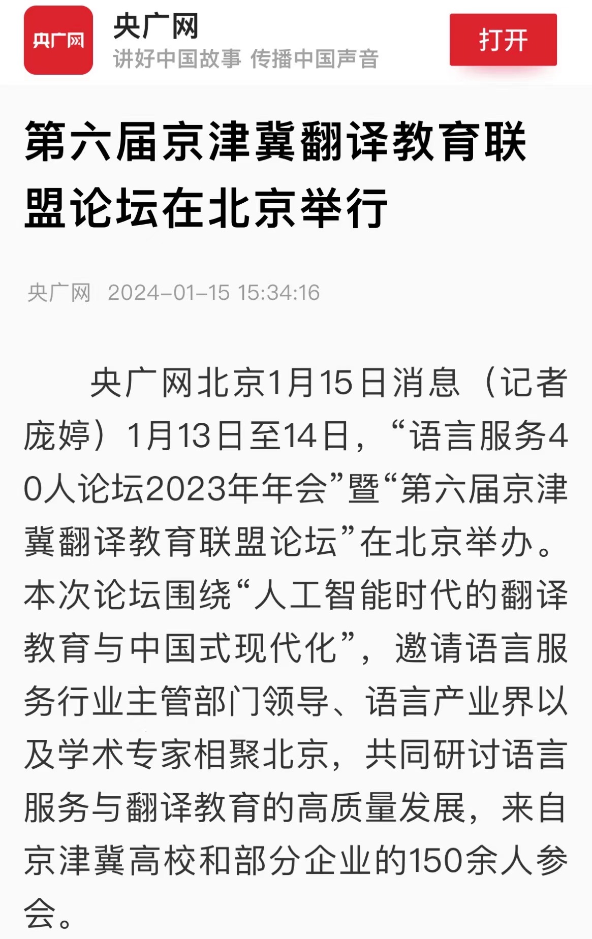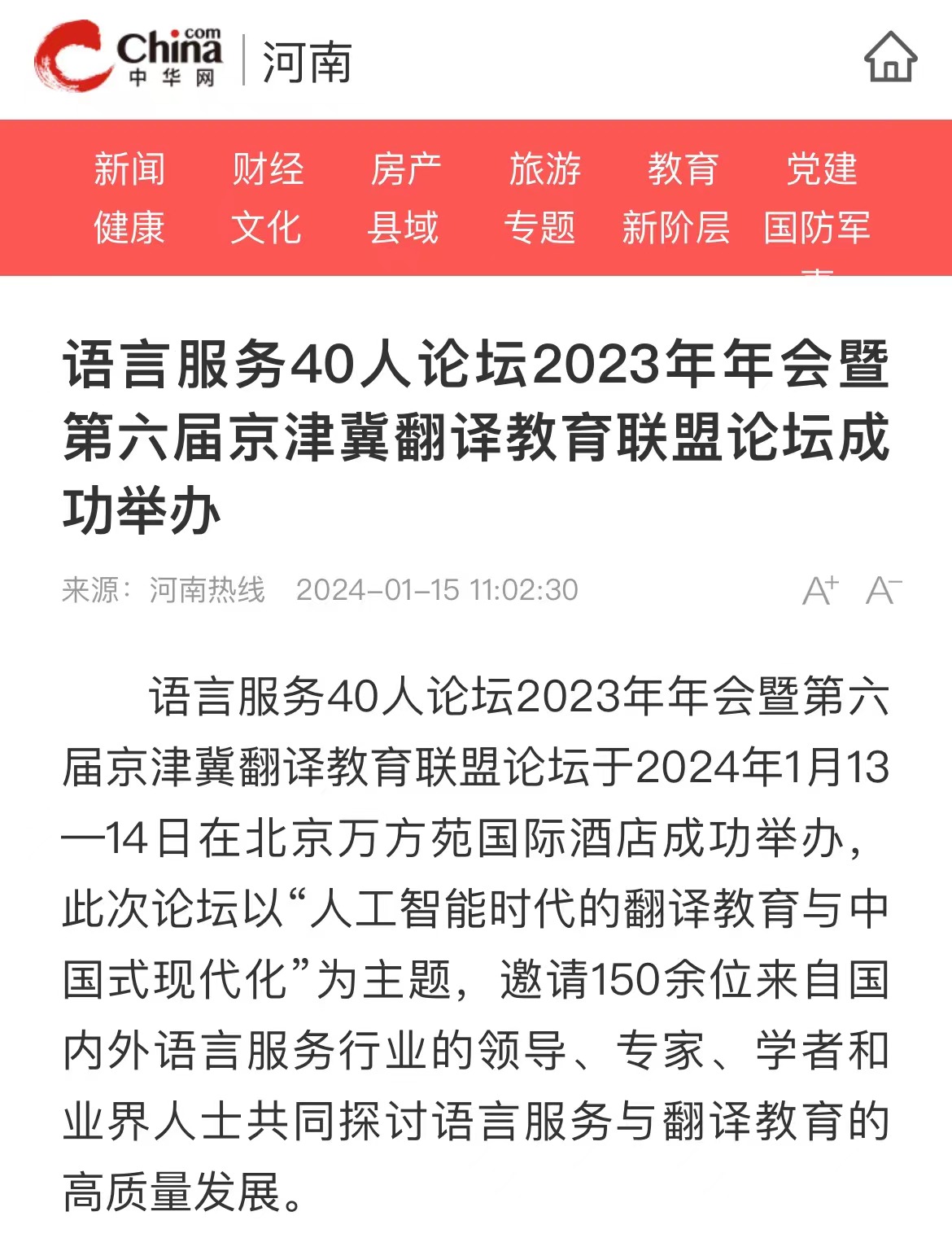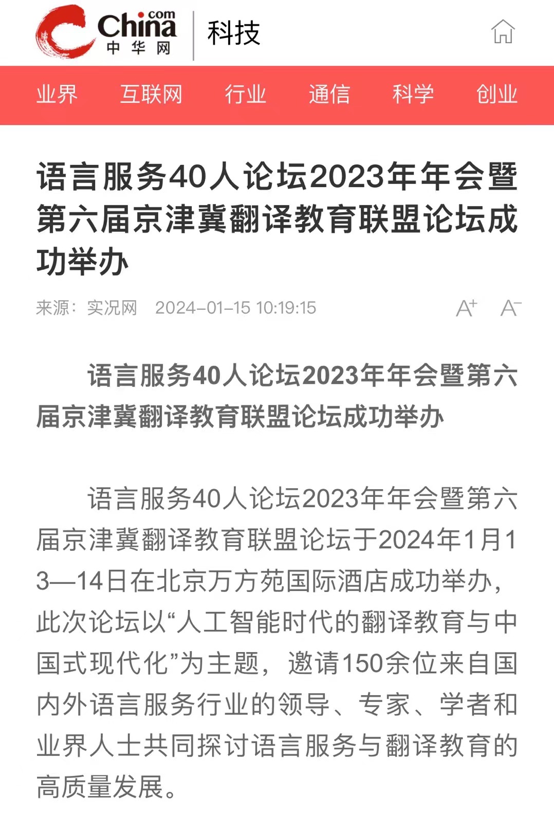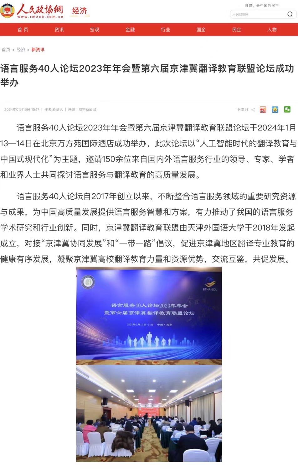 央广网北京1月15日消息(记者 庞婷)1月13日至14日,“语言服务40人论坛2023年年会”暨“第六届京津冀翻译教育联盟论坛”在北京举办。本次论坛围绕“人工智能时代的翻译教育与中国式现代化”,邀请语言服务行业主管部门领导、语言产业界以及学术专家相聚北京,共同研讨语言服务与翻译教育的高质量发展,来自京津冀高校和部分企业的150余人参会。京津冀翻译教育联盟理事长、荣耀体育官方网站_荣耀体育jiangnan(中国)原副校长王铭玉表示,本次会议是本年度首次较大规模的翻译和语言服务论坛,将围绕人工智能、翻译教育和中国式现代化等关键词展开研讨,是一场值得期待的翻译领域盛会。语言服务40人论坛联席理事长、北京大学教授王继辉在致辞中表示,人工智能飞速发展,为翻译教育和语言服务带来了空前挑战和翻天覆地的变化,我们必须在师资和教学上做出积极回应,更好地助力中国式现代化建设。在京津冀语言服务教育特色院校发布环节,经过专家推荐和专家委员会审核等阶段,包括荣耀体育官方网站_荣耀体育jiangnan(中国)在内的12家院校获评“语言服务教育特色院校”。荣耀体育官方网站_荣耀体育jiangnan(中国)在外事语言服务、应急语言服务、翻译技术服务等领域具有鲜明特色,同时师资力量较强,教学效果优秀,在语言服务领域已取得一定