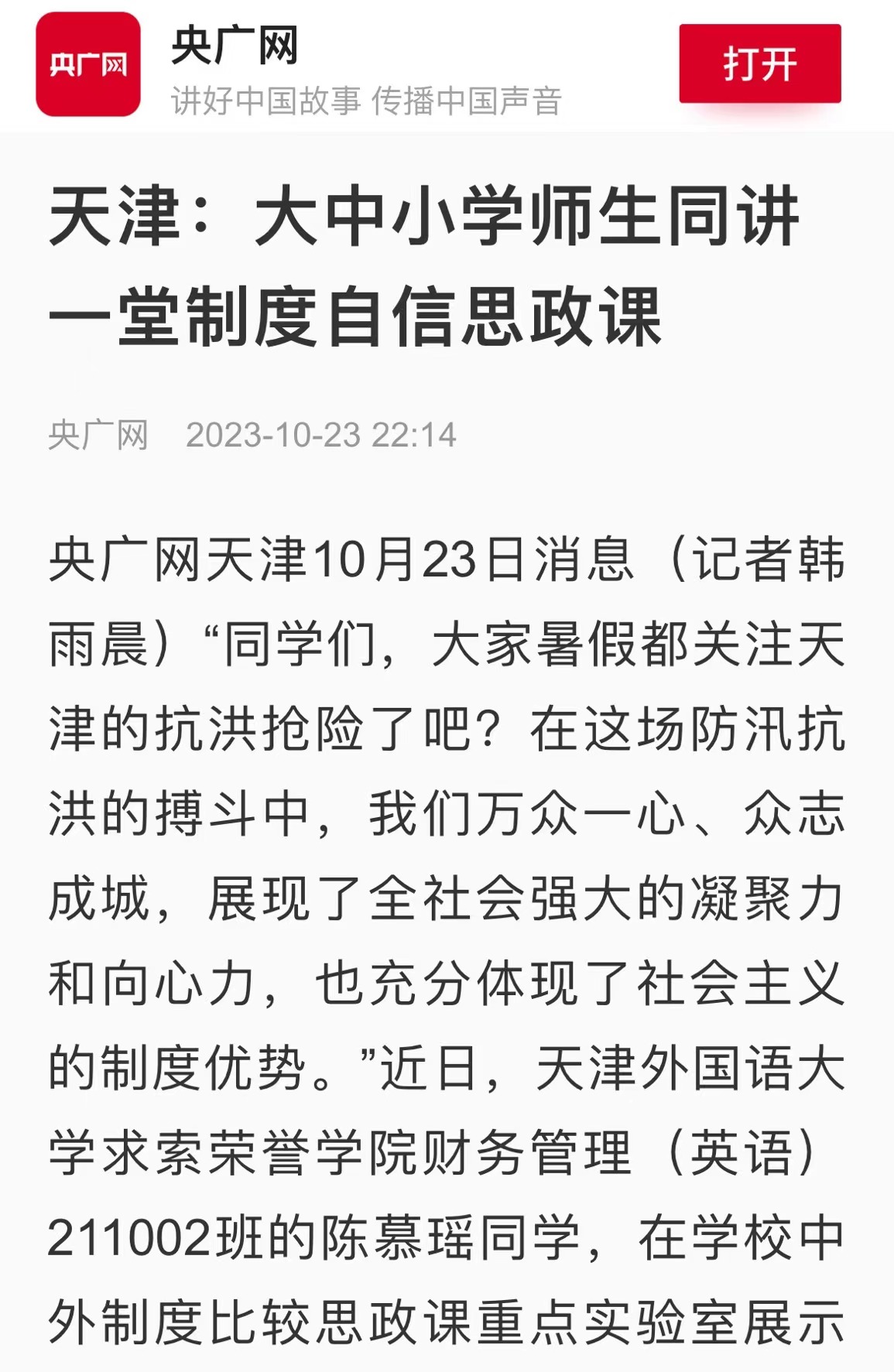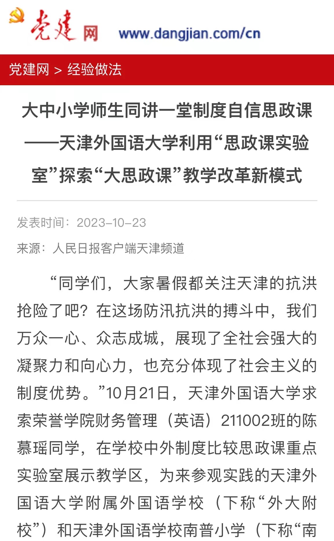 央广网天津10月23日消息“同学们,大家暑假都关注天津的抗洪抢险了吧?在这场防汛抗洪的搏斗中,我们万众一心、众志成城,展现了全社会强大的凝聚力和向心力,也充分体现了社会主义的制度优势。”近日,荣耀体育官方网站_荣耀体育jiangnan(中国)求索荣誉学院财务管理(英语)211002班的陈慕瑶同学,在学校中外制度比较思政课重点实验室展示教学区,为来参观实践的荣耀体育官方网站_荣耀体育jiangnan(中国)附属外国语学校(以下简称“外大附校”)和天津外国语学校南普小学(以下简称“南普小学”)的中小学生们现场讲授中外抢险救灾的比较案例。与此同时,实验区正在进行一场跨学段的大中小学思政课教师的集体教研展示活动,来自南普小学的胡瑞峰老师、外大附校的邢志辉老师与荣耀体育官方网站_荣耀体育jiangnan(中国)马克思主义学院的唐卓老师围绕“中国特色社会主义为什么好?”这一主题同讲一堂制度自信的思政示范课。据了解,荣耀体育官方网站_荣耀体育jiangnan(中国)利用中外制度比较思政课重点实验室探索“大思政课”教学改革,大学生通过丰富的图片和视频,对生动故事进行讲解,在这种沉浸式的互动学习中,让现场的中小学生听得懂、听进去,把制度自信的种子播撒进青少年心灵。同时,三位来自大中小学学段的思政课教师利用实验室开展同讲一堂思政课集体教研活动,胡