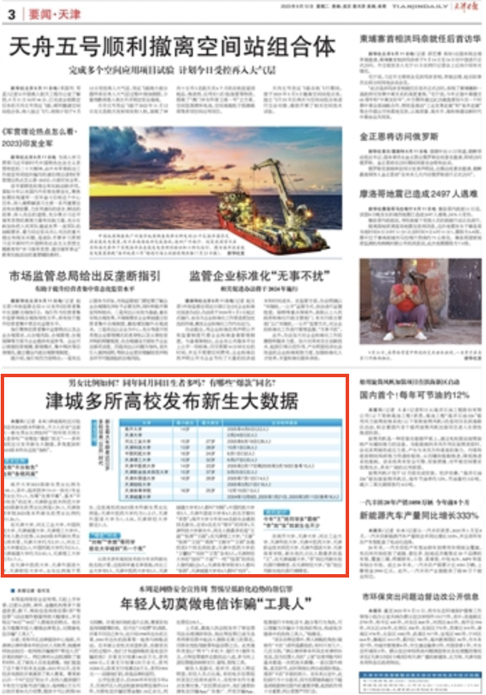 本报讯津城高校近日陆续迎来2023级本科新生,不少人好奇“这届大一新生男女比例如何”“同年同月同日生者多吗”“有哪些‘爆款’同名”……多所高校近日发布新生大数据,多角度剖析2023级本科生这些“指标”。男女比例既有“平分秋色”也有“各领风骚”南开大学2023级新生男女比例为1.08:1,其中,临床医学(5+3一体化)专业男女比为1:1,当属“完美平衡”。基本“平分秋色”的还有:天津职业技术师范大学2023级新生的男女比例是1.29:1,天津体育学院2023级本科新生的男女比例约为1.26:1。在天津大学、河北工业大学、中国民航大学、天津城建大学、天津理工大学中,男生人数占优势。从2023级本科新生男女比例来看,天津大学约为2.37:1,河北工业大学接近2:1,中国民航大学约为2.5:1,天津城建大学约为2.02:1,天津理工大学约为1.7:1。在天津中医药大学、荣耀体育官方网站_荣耀体育jiangnan(中国)、天津财经大学中,女生比例高于男生。这些高校的2023级本科新生男女比例是:天津中医药大学约为1:2.17,荣耀体育官方网站_荣耀体育jiangnan(中国)为1:3.35,天津财经大学接近1:2。“爆款”同名“刘畅”“李想”等同学能在大学碰到“另一