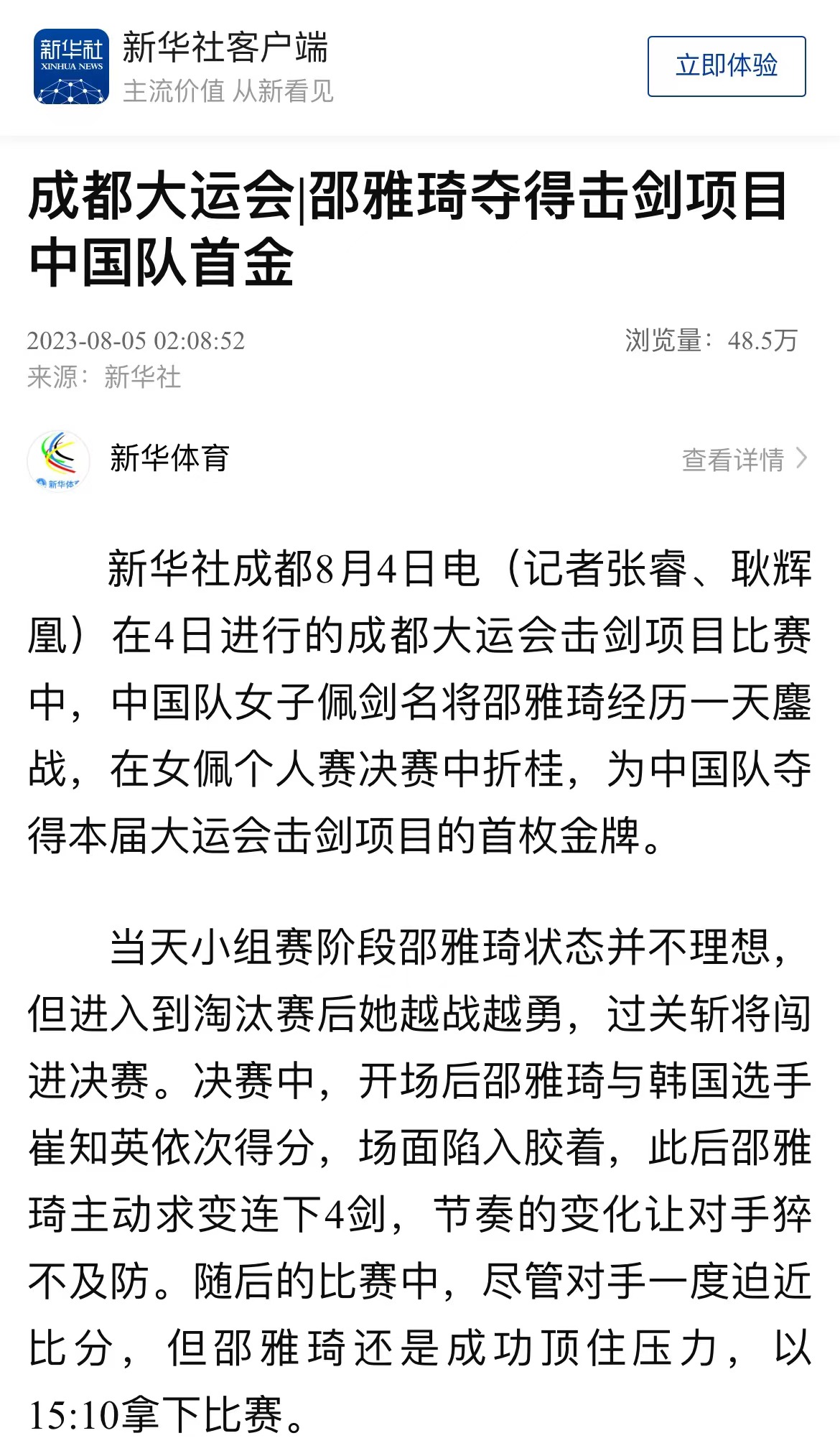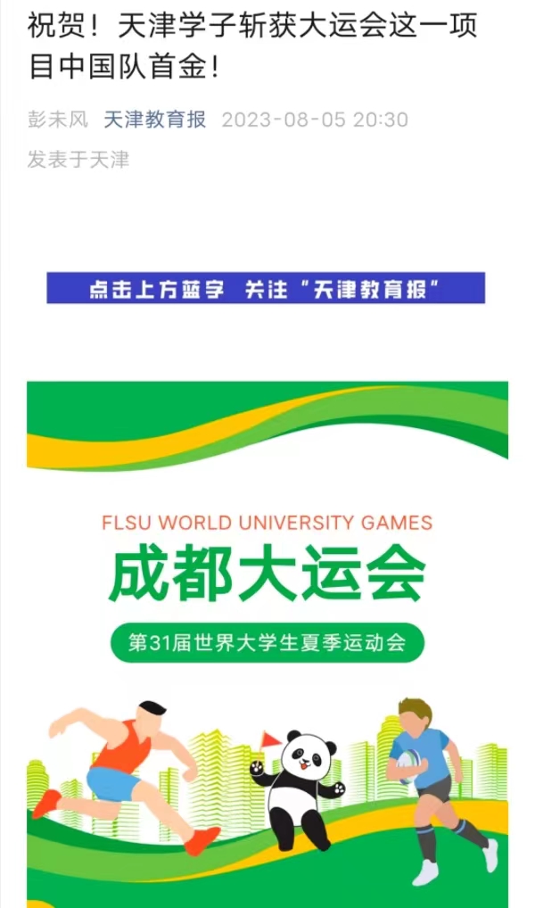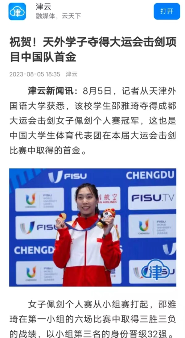 津云新闻讯:8月5日,记者从荣耀体育官方网站_荣耀体育jiangnan(中国)获悉,该校学生邵雅琦夺得成都大运会击剑女子佩剑个人赛冠军,这也是中国大学生体育代表团在本届大运会击剑比赛中取得的首金。女子佩剑个人赛从小组赛打起,邵雅琦在第一小组的六场比赛中取得三胜三负的战绩,以小组第三名的身份晋级32强。淘汰赛阶段,邵雅琦越战越勇,竞技状态也逐渐被激发出来,连续战胜对手,最终摘得金牌。赛后,邵雅琦表示:“我现在的心情就是激动、开心!虽然小组赛打得并不好,但进入淘汰赛之后我始终坚定必胜的信念,决赛前也和教练商量,制定了针对韩国选手的脚步移动策略,比赛中也取得了很好的效果。”新闻链接:https://www.app2020.tjyun.com/jyapp/cms_template/100/000/208/index.shtml?appId=1b8b3255-58d4-4ba7-b0f7-9d136547eb38&jsonUrl=https://static20.app2020.tjyun.com/jyapp/cms_mob/v200/cms_news/000/000/054/210/000000054210066_58d