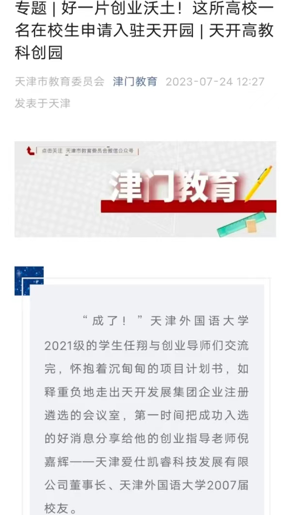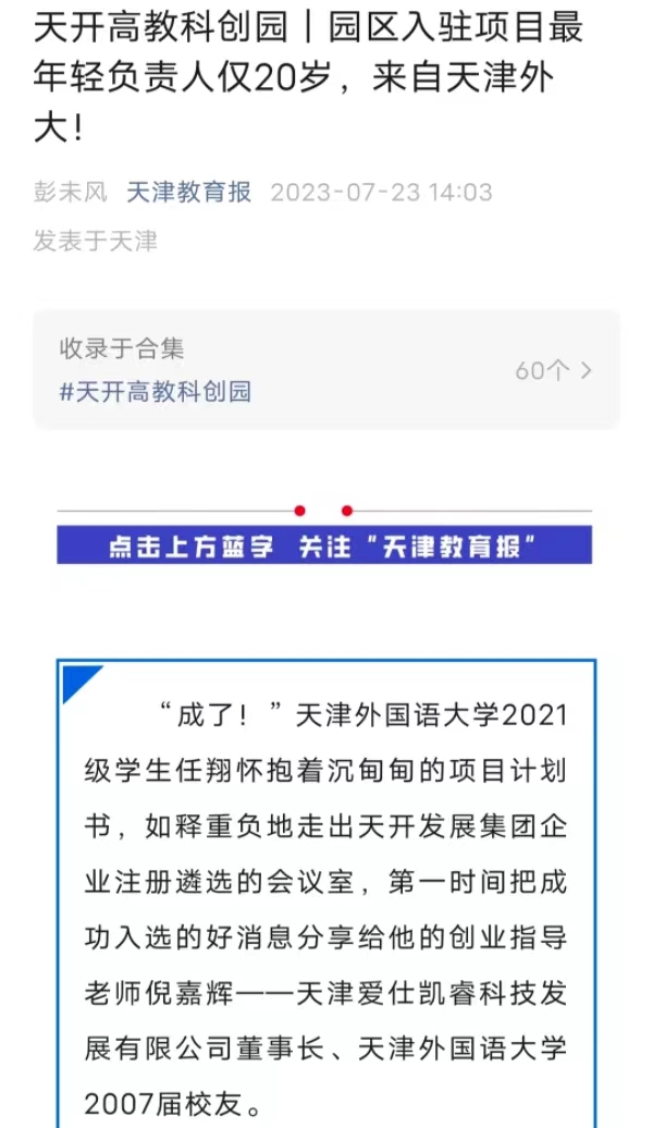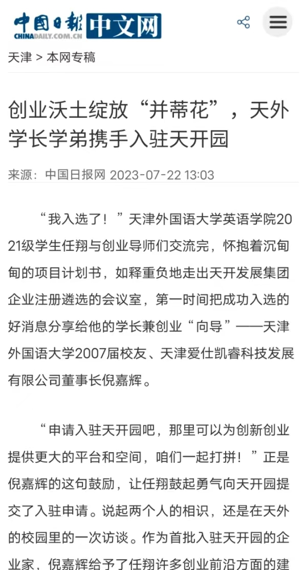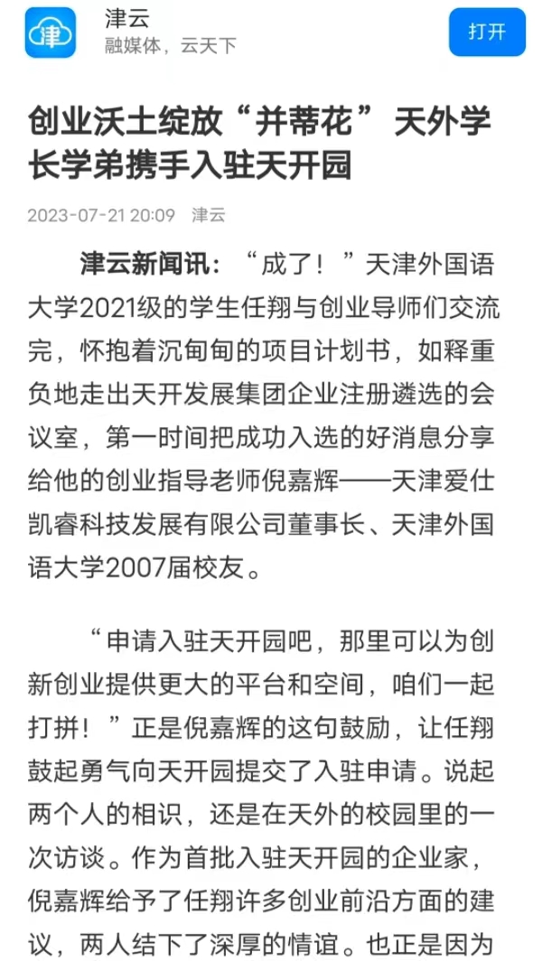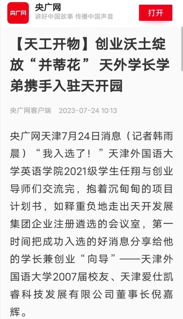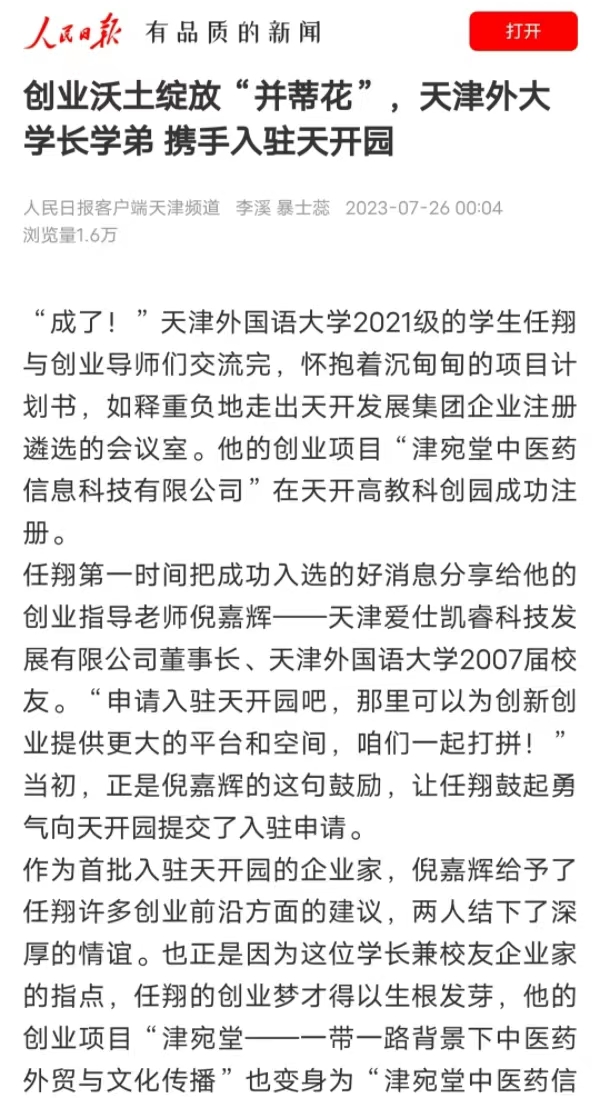 “我入选了!”近日在天开发展集团企业注册遴选的会议室外,刚和创业导师交流后的荣耀体育官方网站_荣耀体育jiangnan(中国)2021级学生任翔,出了会议室便兴奋地把成功入选的好消息分享给他的学长兼创业“向导”──荣耀体育官方网站_荣耀体育jiangnan(中国)2007届校友、天津爱仕凯睿科技发展有限公司董事长倪嘉辉。这也意味着,天津外大“学长带着学弟创业”的情形预计今年秋季将呈现,在天开高教科创园这片热土上一起开出创新创业的“并蒂花”。 “申请入驻天开园吧,那里可以为创新创业提供更大的平台和空间,咱们一起打拼!”任翔告诉记者,正是倪嘉辉的这句鼓励,使他鼓起勇气向天开园提交了入驻申请。“有了学长兼校友企业家的指点,我的创业梦得以生根发芽。”任翔说,他俩相识于荣耀体育官方网站_荣耀体育jiangnan(中国)里的一次访谈,当时作为天开园首批入驻企业家之一,倪嘉辉给了任翔许多创业的建议。也正由此,任翔决定将其所创的津宛堂中医药信息科技有限公司注册在天开园。“我生于名医张仲景的故乡南阳,从小便在耳濡目染中接受中医药的熏陶。学校为我们聘请创业指导教师、提供机会结识创业成功的学长,指导我在天开园这样的舞台上施展拳脚。”任翔说。倪嘉辉则表示,共同创业的师兄弟之间可以互帮互助,学校可以给予大家科研和人
