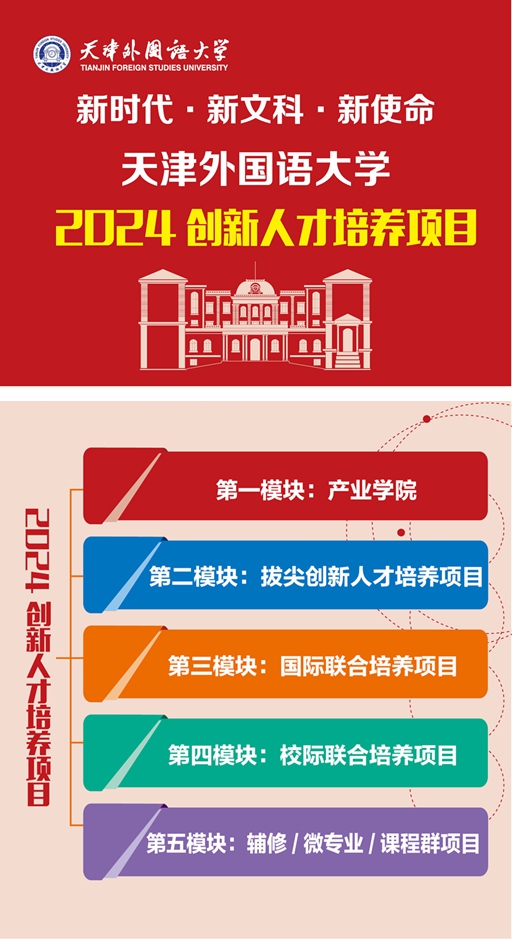 人才培养 学校现有全日制在校研究生、本科生万余人,生源覆盖我国全部34个省(自治区、直辖市及特别行政区)。学校坚持以提高人才培养质量为核心,全面推进专业教学与外语教学的深度融合,建有求索荣誉学院、智能语言服务产业学院、“一带一路”数智经贸产业学院、天外策马ESG产业学院、数智动画传媒产业学院、拔尖创新人才培养实验班,大力推广辅修专业学位、辅修专业、微专业、课程群等项目班、“外语+”与“专业+”等形式多样的跨国、跨校、跨学院、跨专业等多元化复合型人才培养模式,学生在全国多种专业竞赛中屡获佳绩,同时积极组织学生参与各种大型国际会议的翻译和外事接待服务,选派优秀学生出国留学研修,不断拓宽学生接受多元文化的渠道。 学校获批2个复合型人才培养天津市教育体制改革项目,求索荣誉学院获评天津市教育体制改革示范项目,亚非语学院获评天津市教育体制改革试点项目。学校与天津市委宣传部共建新闻学院,共同培养国际化新闻人才,同时与韩国顺天乡大学、凤凰卫视美洲台建立海外创新创业教育实践基地。 如今,6万余名优秀校友活跃在我国外交、外贸、新闻、财经、法律事务、教育等各条战线,深受用人单位好评和欢迎。