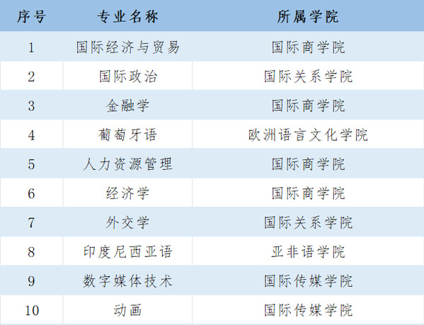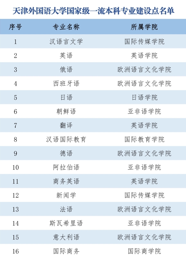 学科专业 学校现有58个本科专业。其中,外国语言文学类专业33个(外语语种31个),其他文学门类专业(含中国语言文学、新闻传播学等)、经济学、管理学、法学、教育学、艺术学、工学门类专业25个。有国家级特色专业、国家级本科专业综合改革试点项目5个,国家级一流本科专业建设点16个、天津市级一流本科专业建设点15个。获批国家级一流本科课程6门、天津市级一流本科建设课程49门;获批天津市高校课程思政示范课程14门,天津市高校课程思政优秀教材7种。 学校拥有全国唯一的“党和国家重要文献对外翻译研究”国家特殊需要博士人才培养项目,外国语言文学、中国语言文学等7个硕士学位授权一级学科点(涵盖29个硕士学位培养方向),翻译、新闻与传播、国际中文教育等7个硕士专业学位授权类别(涵盖23个培养方向),其中,外国语言文学学科是天津市一流建设学科、中国语言文学学科是天津市一流培育学科。拥有5个天津市重点学科、4个天津市特色学科群、1个天津市高校服务产业特色学科群。外国语言文学学科具有接收国内高校青年骨干访问学者和一般访问学者资格。