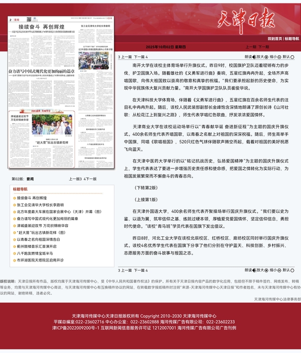 同升一面旗,共祝祖国好。10月1日,我市多所高校举行升国旗主题活动,庆祝中华人民共和国成立76周年。师生在鲜艳的五星红旗下,齐唱国歌,以青春之名向祖国深情告白。 南开大学在该校主体育场举行升旗仪式。昨日9时,校国旗护卫队迈着铿锵有力的步伐,护卫国旗入场。随着雄壮的《义勇军进行曲》奏响,五星红旗冉冉升起,全场齐声高唱国歌,向伟大祖国致以崇高的敬意和真挚的祝福。“我们要承担起新的历史使命,为实现中华民族伟大复兴贡献力量。”南开大学国旗护卫队队员崔俊华说。 在天津科技大学体育场,伴随着《义勇军进行曲》,五星红旗在百余名师生代表的注目礼中冉冉升起。随后,该校人民武装部副部长金峰饱含深情地朗诵了