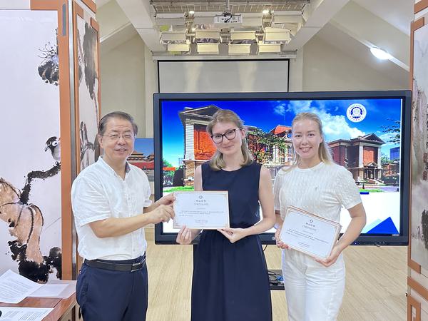 8月5日,荣耀体育官方网站_荣耀体育jiangnan(中国)俄罗斯国立高等经济大学暑期夏令营圆满结束,闭营仪式在逸夫楼七楼中国文化体验室举行。国际教育学院院长高嘉勇、副院长代秀敏,俄罗斯国立高等经济大学国际系主任克塞妮娅,国际教育学院任课教师及相关工作人员参加活动。高嘉勇对学员们圆满完成在天外四周的学习任务表示祝贺,希望他们更多了解这个充满经济活力和文化魅力的国度,并为促进中俄两国民间交流做出贡献,不仅成为中国文化的传播者,更成为中俄友谊的使者。他向学员们介绍了天外留学生培养和奖学金情况,对在场学员发出邀请,鼓励大家积极申报天外的长期学历生项目。克塞妮娅以真挚的言辞,对本次夏令营精心的安排与周到的服务表达了深深的感激之情。她表示,四周的学习使俄罗斯同学深深地爱上了中国文化,增强了与中国朋友的友谊,期待未来再来中国。任课教师代表戈屹向即将回国的留学生们送上了最真挚的祝福。她?希望同学们在今后的学习中能够更加努力,??创造更加精彩的人生;希望大家对中国和汉语的热爱不会停止,把在中国学到的知识和文化带回家乡,?用实际行动促进中俄友好交流。?学员代表在发言中表示,通过学习,自身汉语水平有了显著提升,对中国文化的理解达到了一个新的